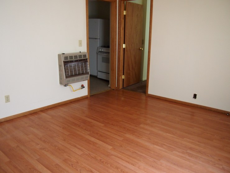 This one bedroom apartment located off the back of the big house at 324 s west has hard floors with carpet in the bedroom and a cozy separate kitchen. Two closets in the bedroom and a glass shower door add some nice features to this budget apartment.
