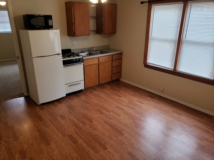 Cozy little upstairs apartment with western and southern windows, just on block from campus, with carpet in the bedroom and hard floor in the combination kitchen, living room.